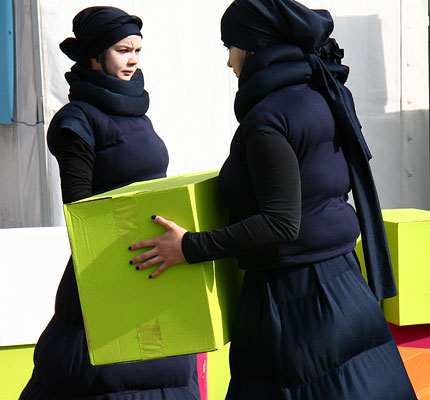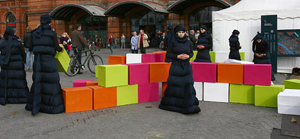 Der Check In! am Bahnhofsplatz besteht aus ca. 500 Kartons, mit denen ein ständiges Auf-, Um- und Abbauen geschieht. Akteure sind die Jugendlichen von act, dem Orientierungsprojekt von Quartier für künstlerische Berufe „on stage und backstage“.