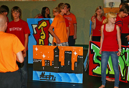 Vier Bremer Schulen sind mit dabei. Eine Woche lang dreht sich für einen ganzen Jahrgang der Klassen 8 -10 alles um das Thema Integration. Der Morgen beginnt mit einer gemeinsamen Tanzprobe, danach arbeiten die Schüler mit Choreographen, Akrobaten, Musikern, Bühnenbildnern in Werkstätten an der gemeinsamen Produktion: Tanztheater, Bühnenbild, Musik. Am Ende der Woche steht eine Tanzproduktion von etwa 20 Minuten.